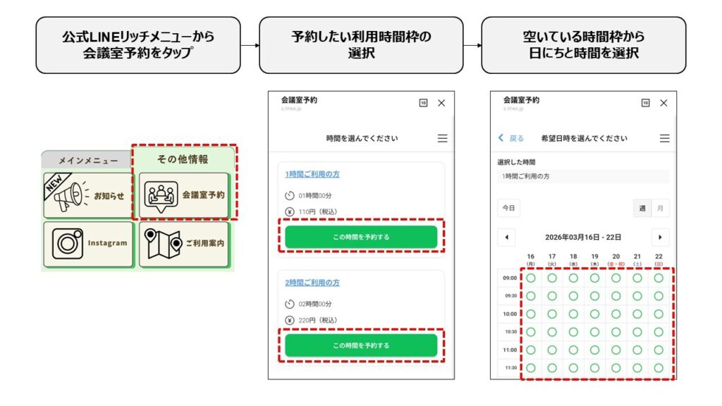 EnGAWA公式LINEアカウントのリッチメニューから、ご希望の日時を選択してご予約ください。会員種別を問わず、すべての会員の方がご予約いただけます。